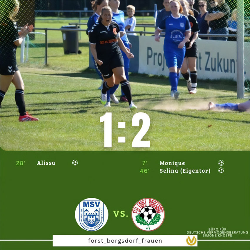 Sonntag der 28.09.2025 reisten unsere Mädels zum Auswärtsspitzenspiel nach Neuruppin,bei herrlichen sonnigen Wetter und angenehmen 17grad. Unsere Frauen starteten hellwach und konzentriert. Borgsdorf hatte viel Ballbesitz, ließ Ball und Gegner laufen, kam aber zunächst kaum zu klaren Chancen. In der 7. Minute war es Kapitänin Moni, die nach Doppelpass mit Anna und Pauli frei durch war und trocken zum 1:0 einschob.