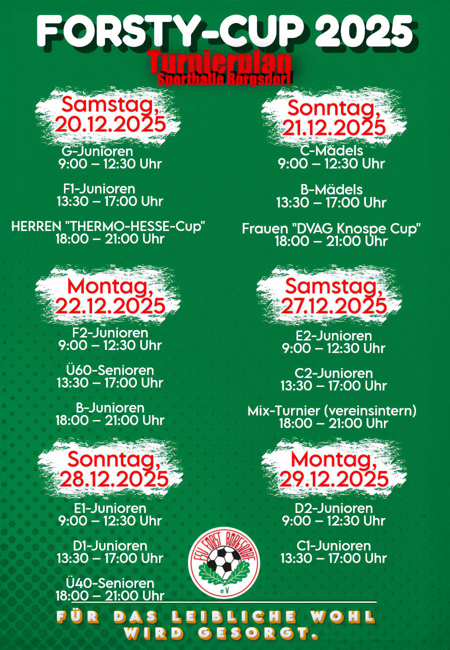 Der Forsty-Cup 2025 steht vor der Tür und macht die Sporthalle Borgsdorf vom 20. bis 29. Dezember zum Treffpunkt für Fußballfans. An mehreren Turniertagen messen sich Nachwuchsteams von den G-Junioren bis zur C-Jugend, dazu kommen Turniere der B- und C-Mädchen, Senioren-Wettbewerbe sowie Spiele der Frauen und Herren.